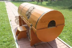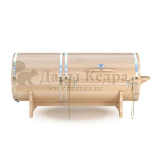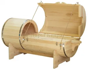 Фитобочка горизонтальная из кедра наиболее комфортна в использовании, потому что во время процедур человек принимает лежачее положение. Она оснащена откидной дверцей, которая во время открывания хорошо держится за счет джутовых веревок. Внутренняя ручка из кедра облегчает открывание и закрывании двери во время использования. Такая модель подходит для оздоровительных центров.